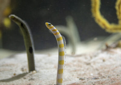 Z méně rozšířených druhů potom musím zmínit akvária s mořskými koníky a jehlami. Rozhodně mě zauly rybky žijící v písku. Vypadají jako malí úhoříci, kteří dohromady vytváření lesík vystrčených hlaviček a kývajících se ve stejném rytmu – ano hádáte správně, zapomněl jsem si najít jejich název, tak příkládám fotku a snad mi někdo pomůže :-).