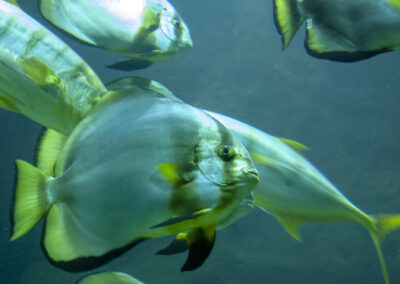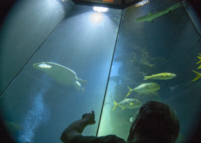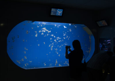 Součástí výstavy je i několik obrovských nádrží z nichž ta největší se žraloky, obřími kanici, čtverzubci a karetou má 300 000l a je přes několik pater budovy. V nejhornějším patře je velké akvárium ve kterém plavou asi metroví kladivouni. Opravdu je na co se dívat.