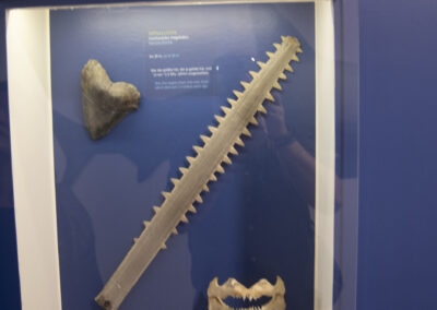 Hned v prním patře máte možnost projít se tunelem, který má umožnit vhled pod hladinu Středozemního moře, kde plavou hejna ryb. O kousek dále jsou vypreparované žraločí čelisti – do největší z nich by se krásně vešla hlava průměrního dospěláka – vyzkoušeno na vlastní dceři. Mezi preparáty je také pilka Pilouna mnohozubého – zajímavé ji takto vidět v životní velikosti.