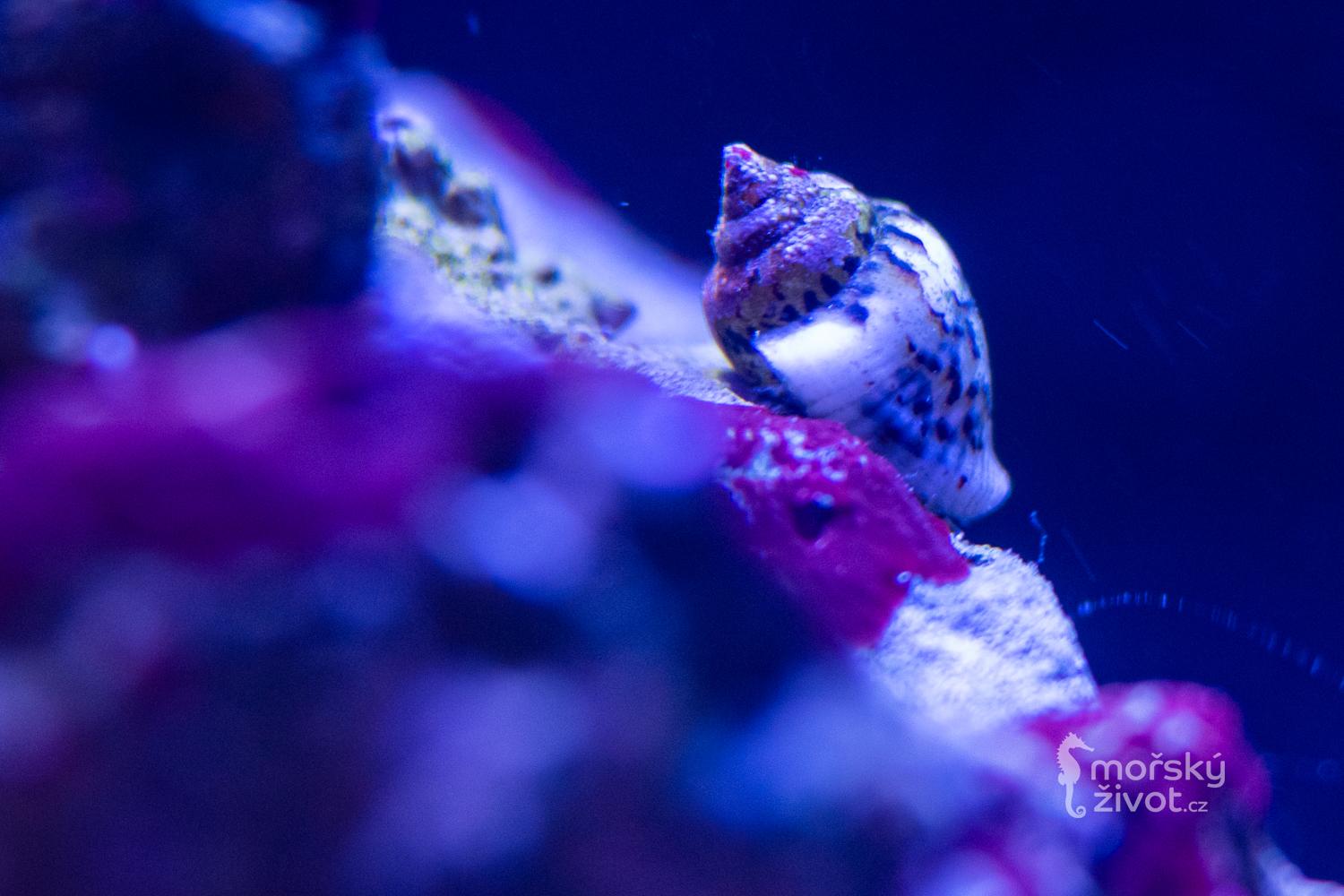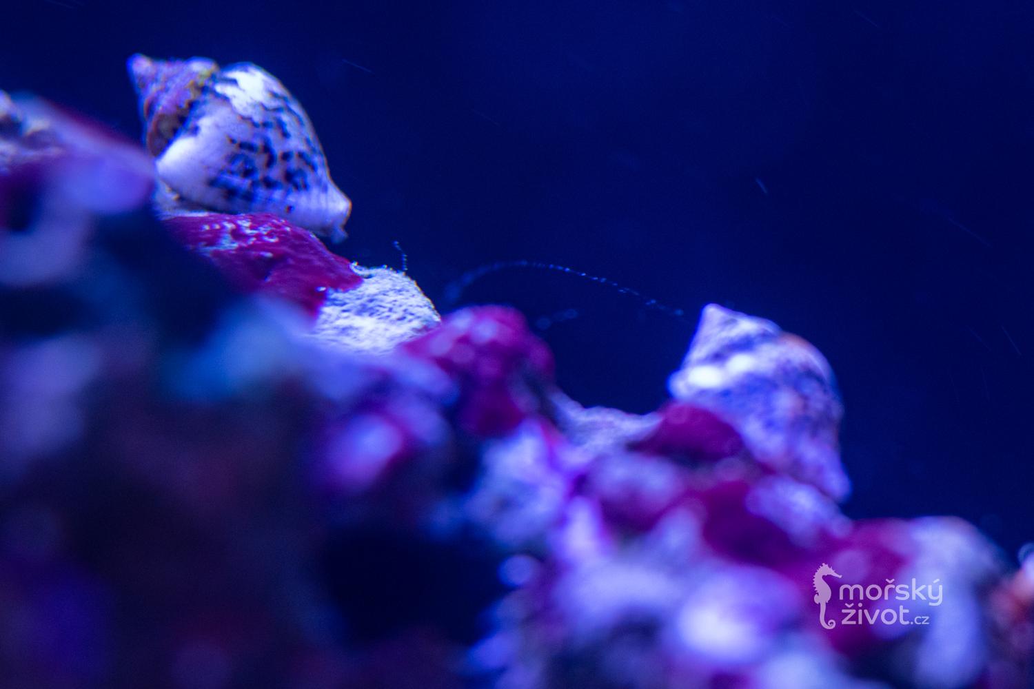 Po čtyřech měsících „zajetí“ akvária jsem přidal šneky 2 ks Trochus histri a 2 ks Nassarius distortu a ještě krabíky 2 ks Calcinus tibicen. Do dvou týdnů tři z těch čtyř šneků uhynuli, čtvrtého nejaktivnějšího, téměř turbo-šneka jsem už pár neviděl. Krabíci se drží a doufám, že to tak vydrží. Opět nevím, zda-li mám nějak málo „bordelu“ v akváriu k úklidu vzhledem k tomu, že „záběh“ byl bez přímého osvětlení, jen z tlumeného zářivkového osvětlení v místnosti. Anebo nějaký problém v chemismu vody. Živý písek na dně a výměna 10% vody á 14 dnů. Nějaké velmi drobné šneky jsem tam na skle občas zastihnul i tu malou hvězdici. Na jednom z kamenů se objevily takové mechové kuličky, vyhodnotil jsem jako tzv. ananasovou houbu, což dle některého z článků na Internetu by mělo svědčit o dobré kondici akvária. Dám tomu čas při pozorování krabíků.