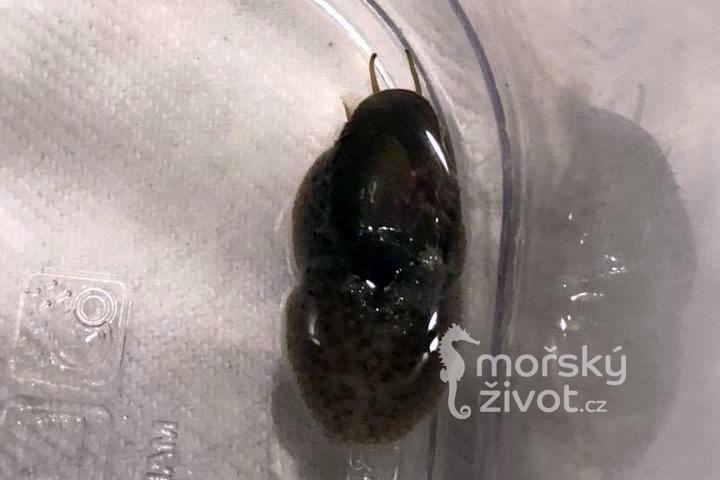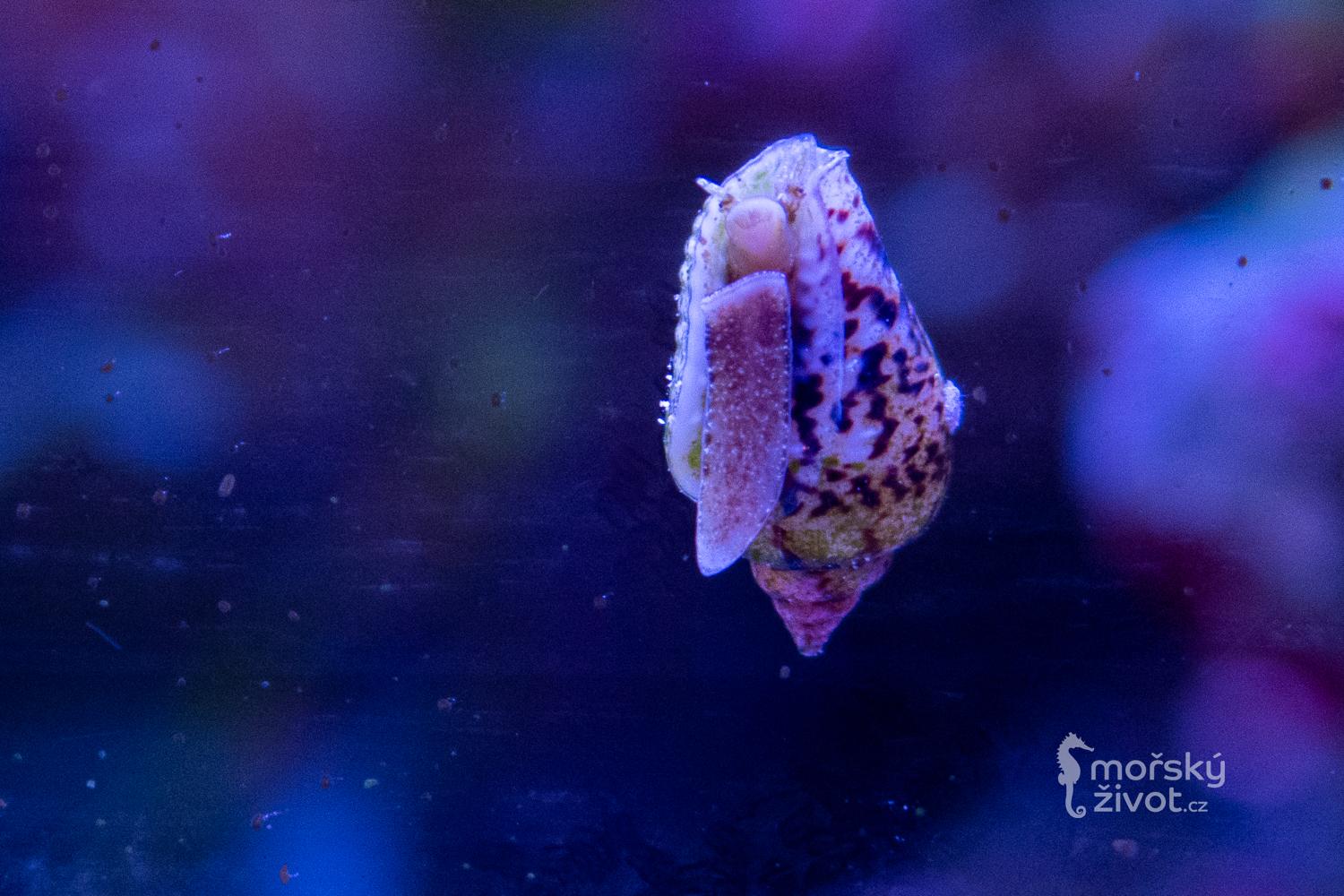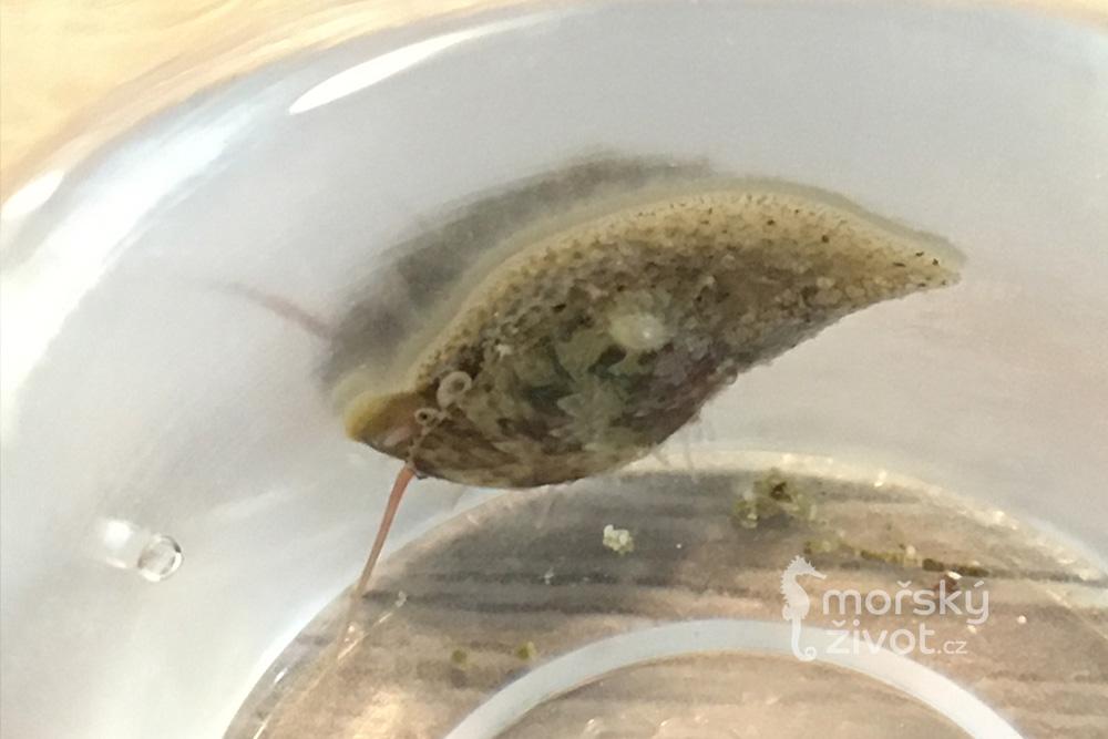 Jednoznačně klaďas a noční pracant. I když se to na první pohled nezdá, tak se jedná se o šneka s ulitou – velmi malou na horní straně těla – jakoby přilepenou mušličku na slimákovi. Je to býložravec, který bude celou noc cestovat po útesu a obírat řasu. Barevnost může být od velmi tmavé až černé až po světle hnědou. Někdy ho můžete přistihnout, jak si vyleze na horní část útesu a začne vypouštět jakoby bílý oblak do vody… nelekejte se, jedná se jen o jeho způsob rozmnožování, kdy do vody vypouští spermie.
